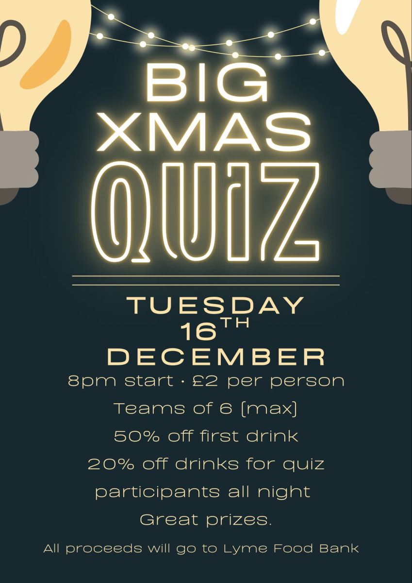 Come together at The Royal Lion on Tuesday 16 December, 8pm for the Big Xmas Quiz, raising money for Lyme Regis Food Bank.