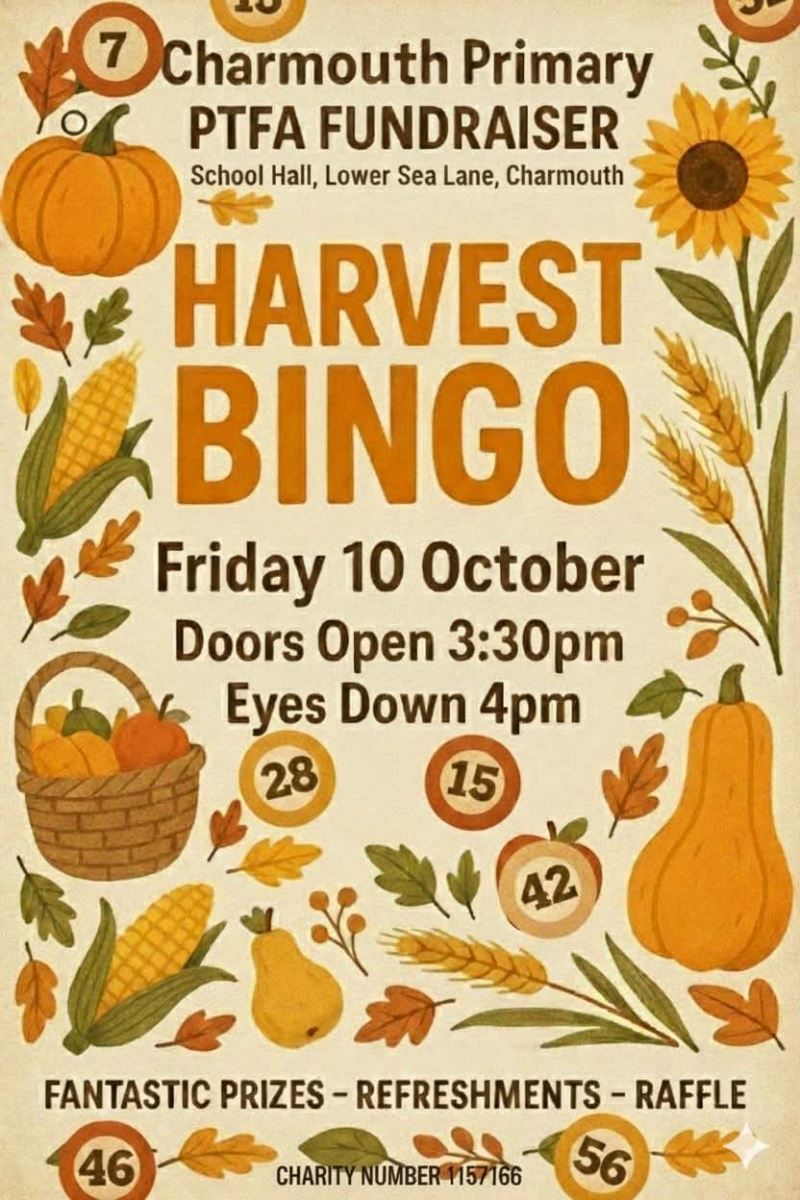 Get ready for an afternoon of fun and prizes as Charmouth Primary PTFA hosts its Harvest Bingo Fundraiser on Friday 10 October at the school hall, Lower Sea Lane, Charmouth.