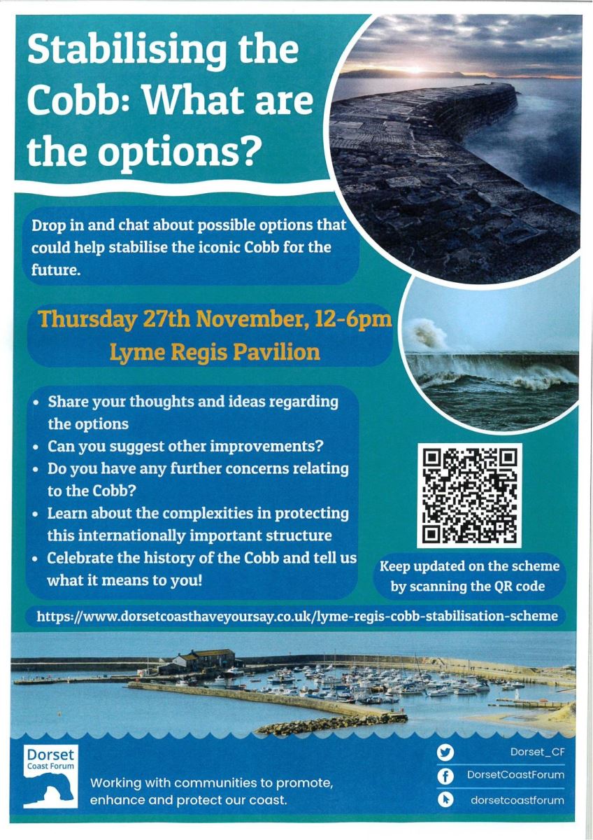 21 October 2025 Cobb Stabilisation Discussion Thursday 27th November, 12pm-6pm, Lyme Regis Pavilion. Lyme Regis Cobb Stabilisation Scheme | Dorset Coast Have Your Say Community noticeboard Events News Share Tweet