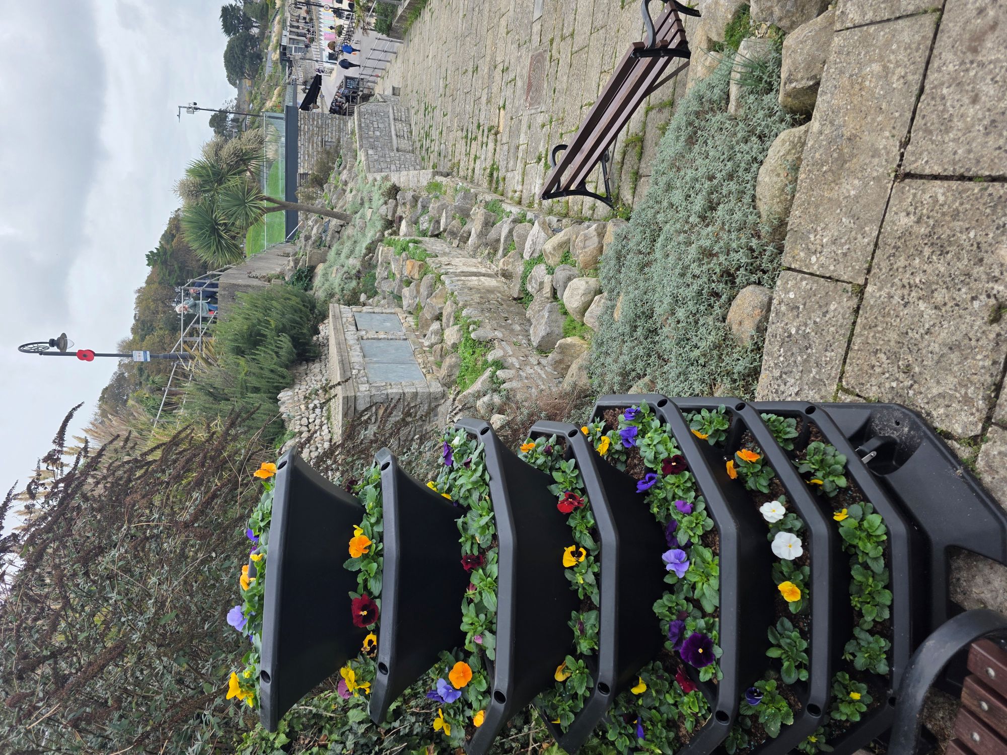Two new seven-tier tower planters have been installed, featuring seasonal flowers, adding some colour to the area.