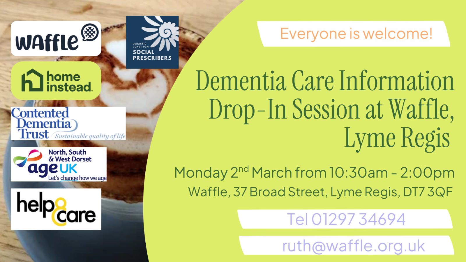 Dementia care information drop-in session at Waffle Lyme Regis, Monday 2nd March 10:30am-2pm.