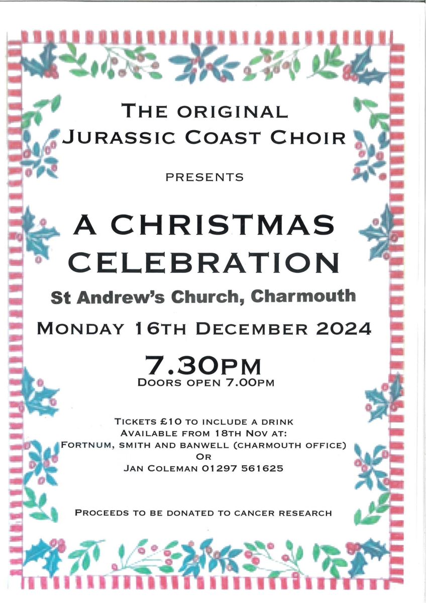 Join us for a magical evening of festive music with The Original Jurassic Coast Choir as they present "A Christmas Celebration" at St Andrew's Church in Charmouth on Monday, 16th December 2024, 7.30pm.