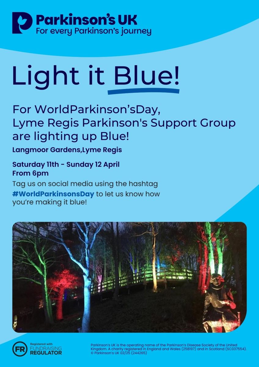 From 6pm on Saturday 11th and Sunday 12th April, Langmoor Gardens will be illuminated in brilliant blue in support of World Parkinson's Day.