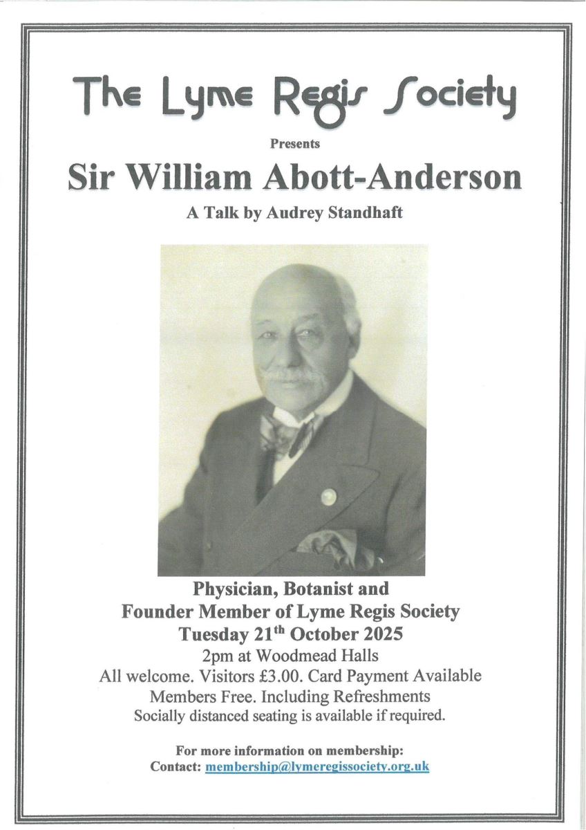 22 October 2025 The Lyme Regis Society presents a talk about Sir William Abott-Anderson The Lyme Regis Society presents Sir William Abott-Anderson, a talk by Audrey Standhaft. Tuesday 21st October 2025 at Woodmead Halls. All welcome. Visitors £3. For more information on membership, contact membership@lymeregissociety.org.uk Events Share Tweet