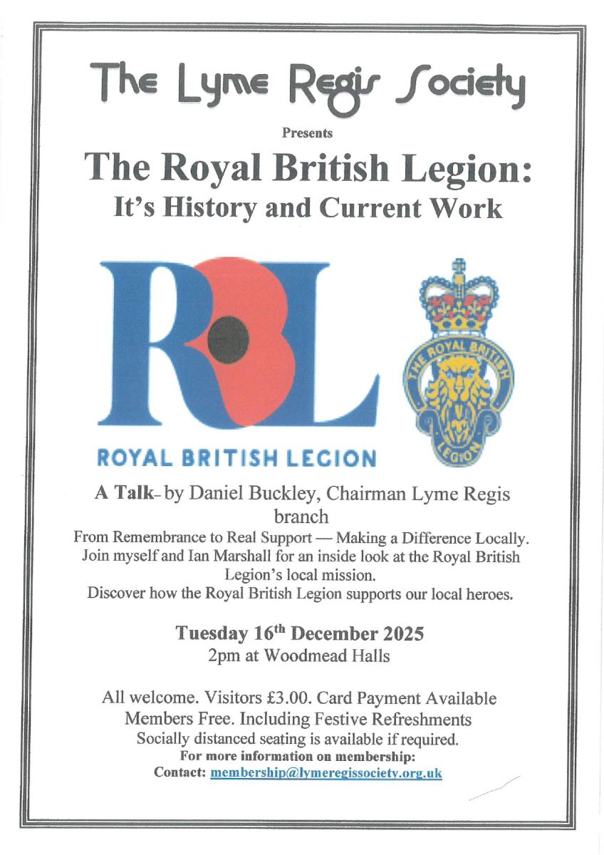 The Lyme Regis Society presents a talk by Daniel Buckley, Chairman of the Lyme Regis branch of the Royal British Legion, on Tuesday 16 December 2025, 2pm at Woodmead Halls.